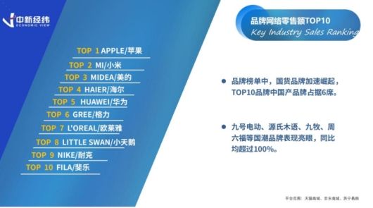 根据《报告》,随着国潮国风涌现,国产品牌受到热捧。网络零售额品牌榜前十中,小米、美的、海尔等国产品牌占据6席。