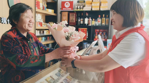 “老板娘,祝您母亲节快乐!”志愿者吴芳芳捧着一束粉色的康乃馨走进东川零售店内,店主成云妃的脸上露出惊喜的表情,激动地说:“哇,这个花真好看!谢谢你们啊!刚才我儿子也打电话跟我说节日快乐呢,没想到这么快就收到鲜花啦!”