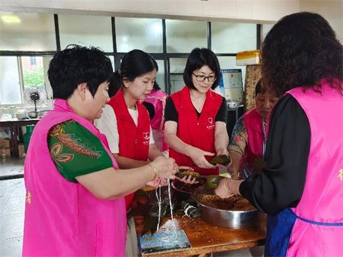 图为香溢志愿者同“好姆妈”爱心团一起包粽子