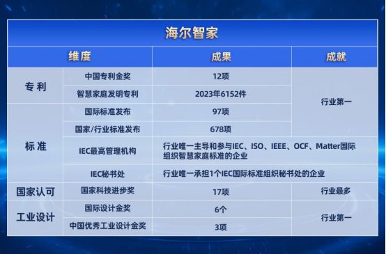 在专利领域,海尔智家获得12项中国专利金奖,行业最多;2023年新增6152件智慧家庭发明专利,实现全球十连冠。在标准领域,国际标准发布97项,国家/行业标准发布678项,均为行业最多;海尔智家还是行业唯一主导和参与IEC、ISO、IEEE、OCF、Matter国际组织智慧家庭标准的企业。在工业设计领域,获得6项国际设计金奖,行业最多。