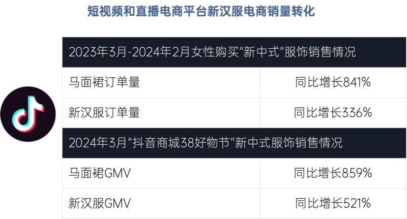 从销量来看,短视频和直播电商带动下,新汉服整体销量从整体、分布和深化均有较强提升。仅2024年3月,抖音电商新汉服销售量环比2月增长58%,同比去年3月增长549%;新中式服装销售量环比2月增长136%,同比去年3月增长1238%。其中女性用户订单量同比提升195%,马面裙的订单量同比增长841%,新汉服、宋锦外套、香云纱服饰的订单量同比增长分别为336%、225%、112%。各传统电商也借短视频和直播电商平台推动,新汉服销量大增。