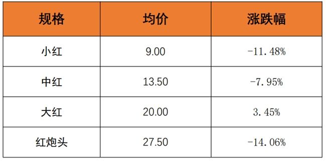 具体而言,截至6月24日,红虾均价报20.00元/斤,环比下跌8.10%。其中,小红均价报9.00元/斤,环比下跌11.48%;中红均价报13.50元/斤,环比下跌7.95%;大红均价报20.00元/斤,环比上涨3.45%;红炮头均价报27.50元/斤,环比下跌14.06%。