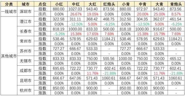 从主要销区城市行情来看,截至6月24日,深圳、长春小龙虾价格指数整体稳中有升,其中深圳中红涨幅最高,环比上涨26.67%,长春大红涨幅最高,环比上涨17.65%。潜江、成都两市小龙虾价格指数均表现为大虾上涨,炮头虾下跌,潜江与成都两市大虾价格分别环比上涨5.00%、11.75%,炮头虾价格则分别环比下跌6.25%、21.88%。其余城市各规格品价格保持稳定。