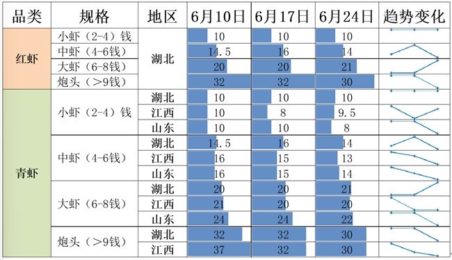 截至6月24日,青虾均价报17.50元/斤,环比下跌7.08%。其中,小青均价报9.00元/斤,环比下跌10.00%;中青均价报13.50元/斤,环比下跌7.95%;大青均价报20.00元/斤,环比上涨1.69%;青炮头均价报27.50元/斤,环比下跌11.29%。