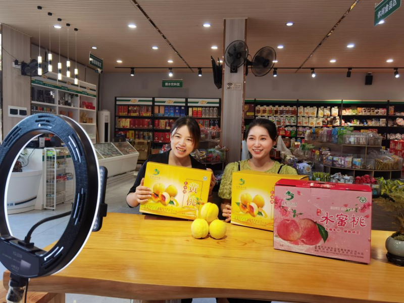 “我们村合作社种植的桃子开园了,外皮薄而多汁,果肉饱满细腻,既新鲜又好吃,欢迎大家在我直播间下单,顺丰包邮到家。”这样的直播场景,如今在怡海村已随处可见。