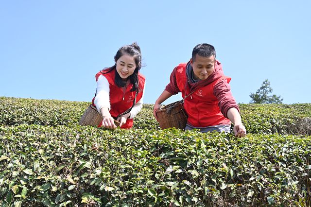 图为该局青年员工帮助农户采茶
