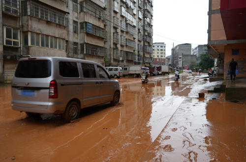 抵达店铺时,门店已经被重重黄泥包围,车辆驶过泥水飞溅,下脚的地方都没有。