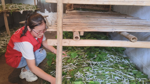 王婧以回来后便把王阿姨的难处跟志愿帮扶队反应,新昌县局(分公司)“香溢”志愿帮扶队立即组织小分队前往王阿姨家里,帮助王阿姨采摘桑叶,并把一捆捆桑叶背到家里,然后再喂给蚕宝宝。