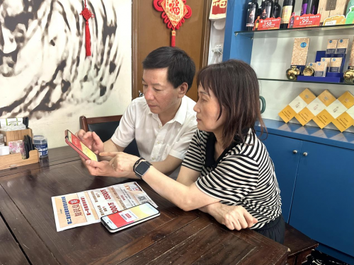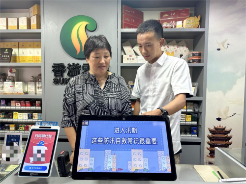 图为客户经理入店宣传防汛知识