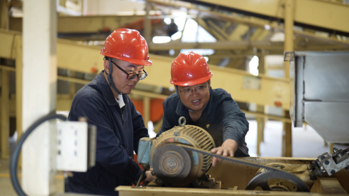 (张慕峰(右)带领罗幅元(左)正在修理故障机器)