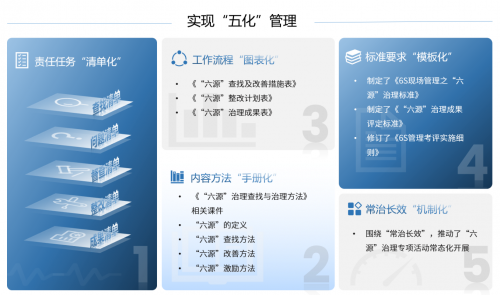 扎实推进,立言立行“改”。各部门在规定时间之前按照推进办反馈的经评审确定的改善措施完成“六源”清除,并对整个整改过程进行追踪记录,形成“六源”治理整改清单。推进办根据评定标准对产生的“六源”治理案例进行评价,并设定具体的奖惩措施。对优质“六源”治理的过程、成果进行宣传和提炼,并组织申报相关课题,推广成功经验做法,形成相关标准及管理制度。