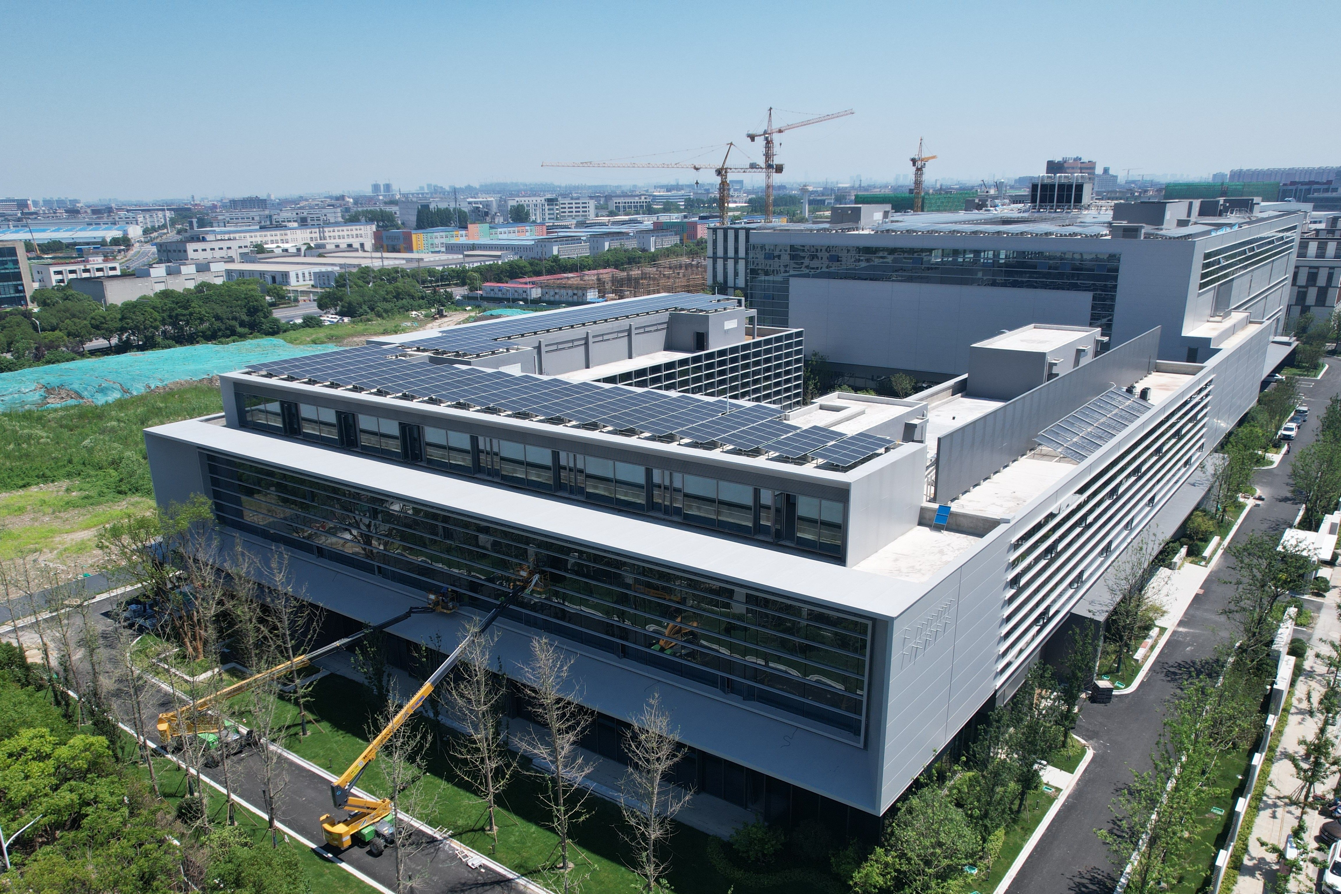 项目位于上海市松江区车墩镇,总建筑面积5.63万㎡,由生产厂房、办公与宿舍楼及配套设施组成,为兼具中庭合院式、现代简约风格的的智能智造基地与工作生活空间。基地研发制造的产品将广泛应用于工业自动化、电动汽车、风能、太阳能等新能源行业,为节能减排再添“芯”动能。