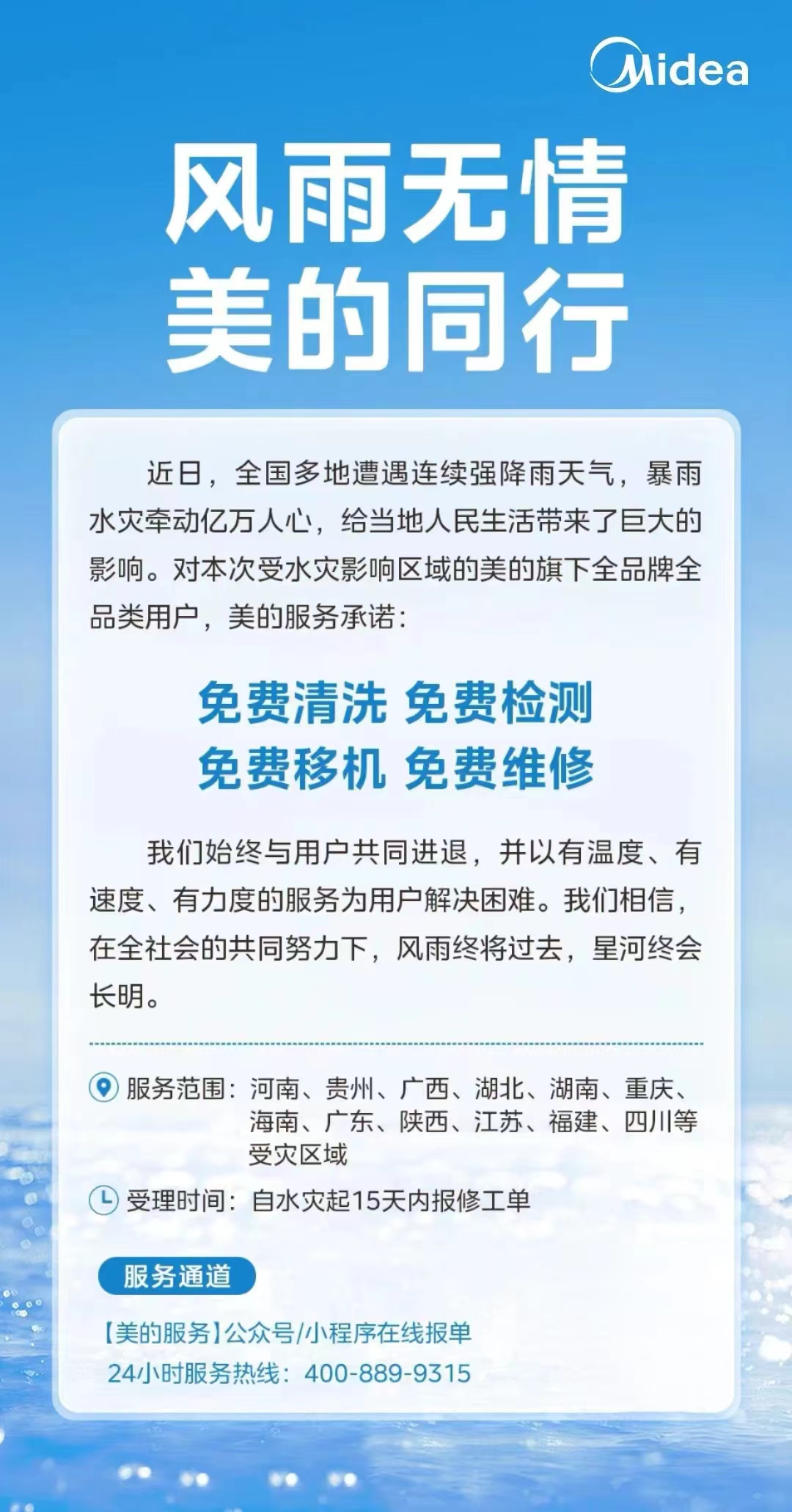 灾难的发生,影响了众多家庭的日常,家电损坏不仅给生活带来了不便,同时也增加了经济上的压力。在得知这一情况后,美的立即启动了“风雨同舟/美的服务,与你同行——受灾家电免费维修”活动,为受灾区域用户提供包括免费清洗、免费检测、免费移机、免费维修在内的“四免”服务,覆盖了河南、贵州、广西、湖北、湖南、重庆、海南、广东、陕西、江苏、福建、四川等受灾区域。