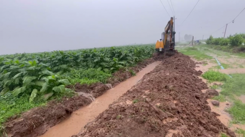 “来来来,先把这边的淤泥清出去,这条沟必须赶快挖通,今天晚上雨水排不出去,地里的烟叶就全毁了。”在临颍县王孟镇烟田里,王孟烟站站长裴志强正冒着大雨指挥挖掘机疏通地头的沟渠。