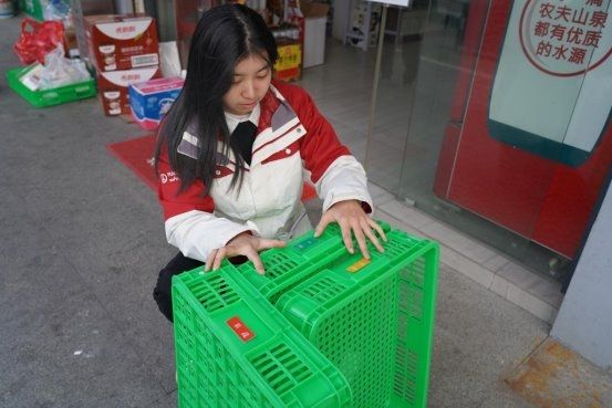 图为“香溢”志愿者周奥淋帮助驿站整理助农箩筐