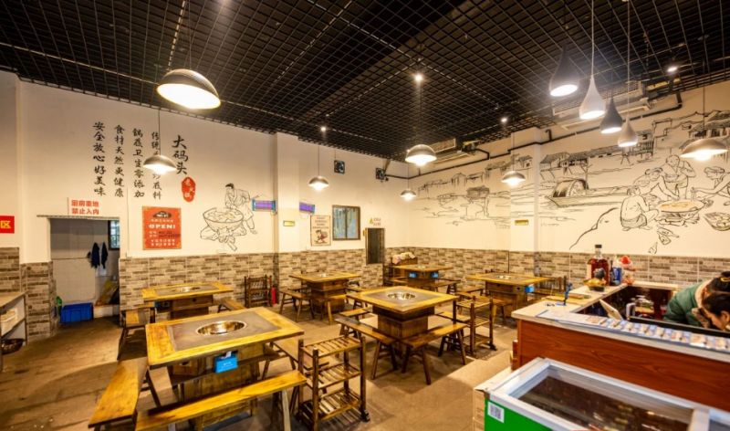 “街头小巷子,开个么店子”,作为扎根马家堡十余年的老牌火锅,雾都大码头积极发扬和传承重庆的的视觉基因,其店面装修简约而不简单,一张方桌、四根条凳,还原老重庆老火锅本质的味道;店内墙上绘有滚滚江水、缕缕青烟以及侃侃而谈的船夫,寥寥数笔让食客梦回从前。
