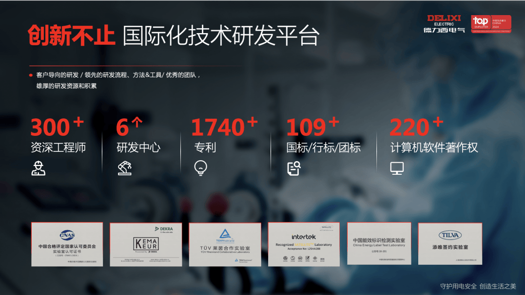 截至目前,公司累计拥有1740余项有效专利及220余项计算机软件著作权,109项国标/行标/团标,这些沉甸甸的数字,是德力西电气科技创新实力的最佳注脚,不仅彰显了德力西电气在行业标准制定方面的翘楚地位,更为行业发展树立了标杆。