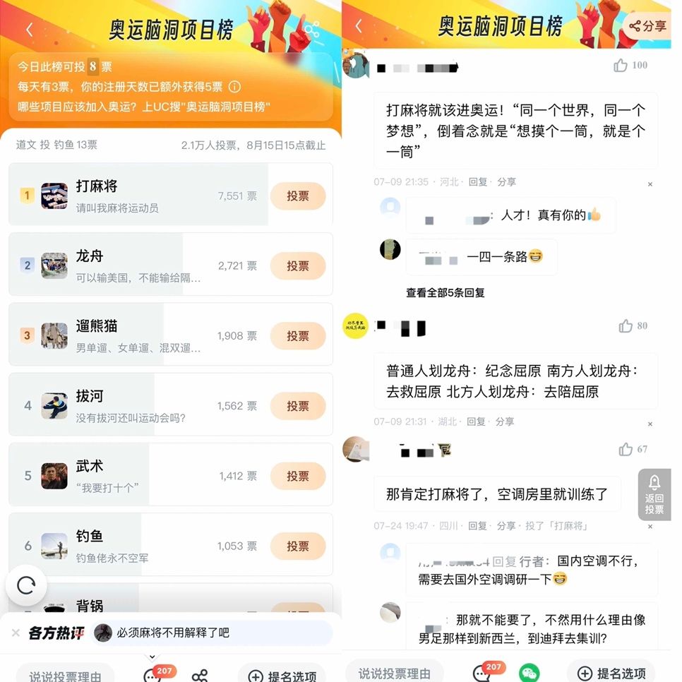 本届奥运会新增了霹雳舞、运动攀岩等项目,UC网友们也在“脑洞项目榜”上大胆提名,建议将“国粹入奥”——麻将、广场舞、掼蛋等国民休闲娱乐项目引发不少网友投票。这一提议引发了不少网友的投票和讨论。网友们纷纷表示:“没有拔河还能叫运动会吗”,也有不少体育迷调侃道:“别叫我麻友,请叫我麻将运动员”“打麻将空调房里就能训练”。