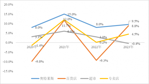 2020-2022年,零售各个业态受到不同程度影响,但奥莱业态表现持续坚挺,年度增长率居于主要零售业态首位。2023年奥莱业态销售额约为2300亿元,同比增长约9.5%,依然在众多业态中排名第一。这源于奥莱的抗周期性,在经济和零售市场下滑时,能够保持相对稳定。