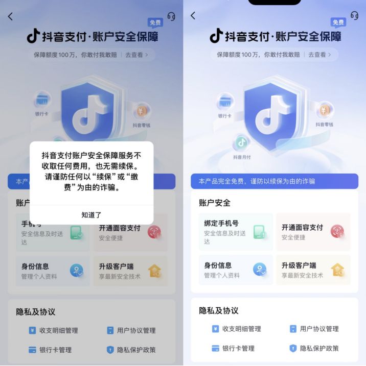 抖音安全中心相关人员表示,上述骗局实际上是假冒抖音支付推出的“百万保障”的名义来施行诈骗。早在2021年4月,抖音支付联合中国人保财险,为用户免费提供一项账户安全保障,用户的抖音支付(包含零钱、银行卡、抖音月付)账户如果被他人盗用而产生资金损失,平台承诺按损失金额不限次赔付,每年赔付金额累计最高100万元(俗称“百万保障”)。该项保障不收取用户任何费用,也无需续保,长期有效。