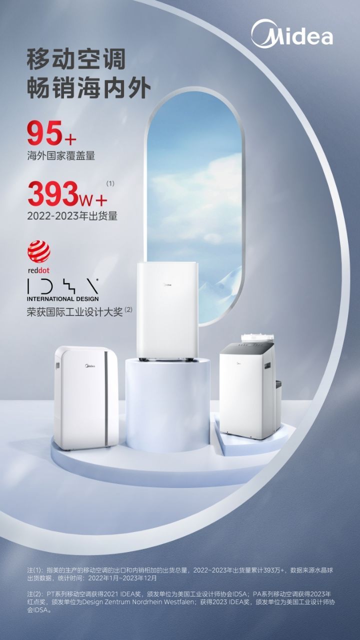 在众多移动空调品牌中脱颖而出,美的空调凭借39年在空调行业的专注研发,凭借其强大的技术创新能力,荣获多项专利技术,确立了其在行业中的领先地位,并在全球范围内受到广泛欢迎。2022~2023年美的生产的移动空调出货量达393万台,覆盖90多个海外国家。