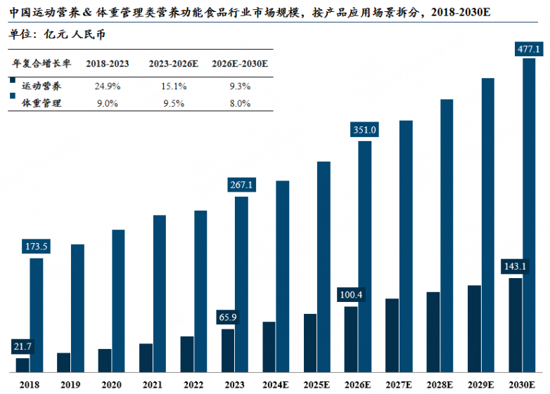 从细分市场上看,健康中国大背景下的体重管理 & 运动营养需求高企,“三减三健”呼吁下营养功能食品成为热点,未来6年依然保持高速发展。