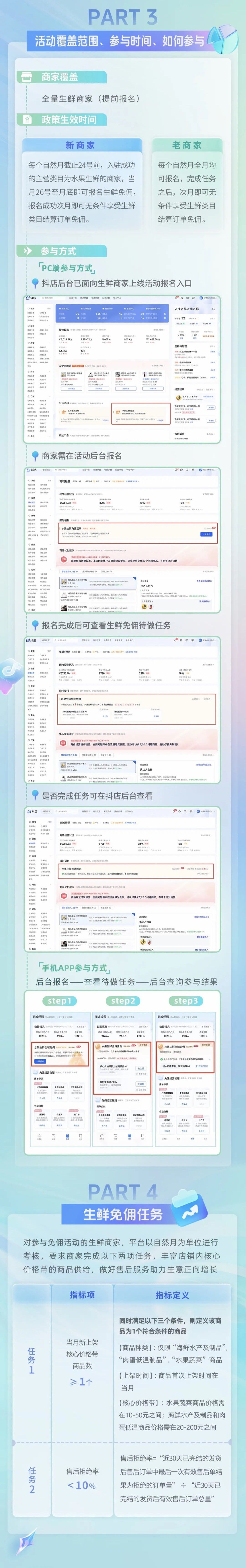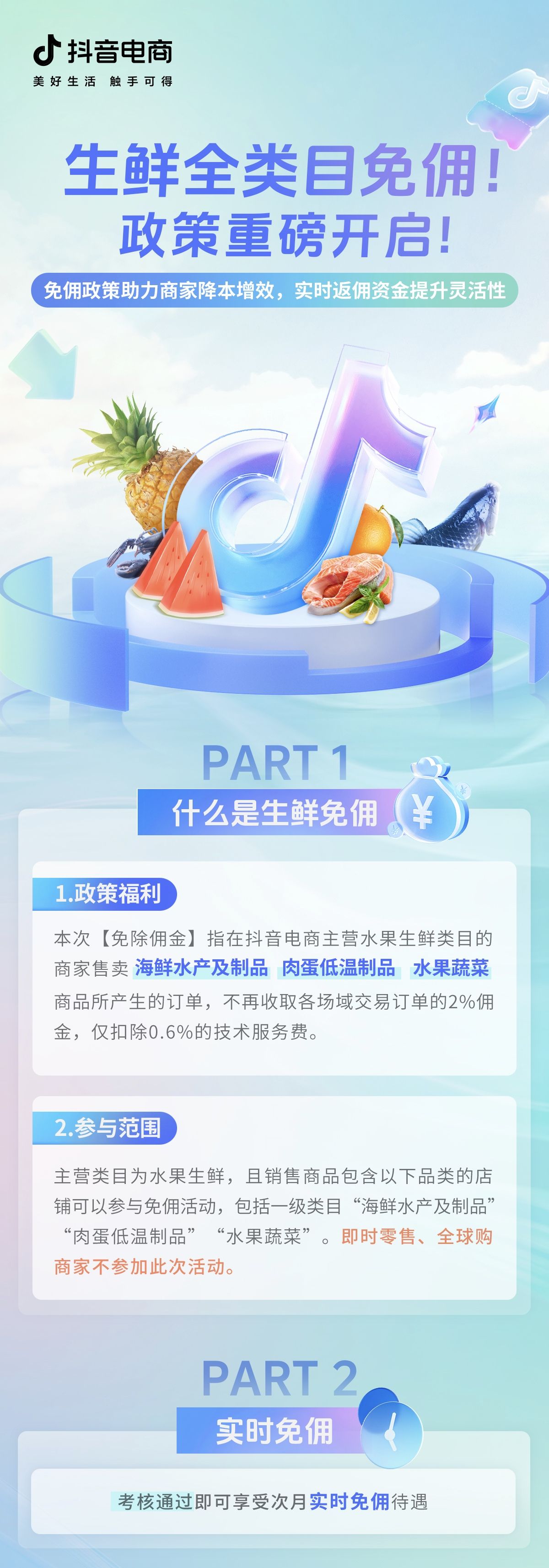 7月16日,抖音电商重磅宣布开启首期生鲜行业全类目免佣活动,在抖音电商主营水果生鲜类目的商家,当月报名成功且完成低门槛任务后,对于其售卖"海鲜水产及制品""肉蛋低温制品""水果蔬菜"商品所产生的结算订单,次月享受实时免佣,不再收取各场域交易订单的2%佣金,仅扣除0.6%的技术服务费。
