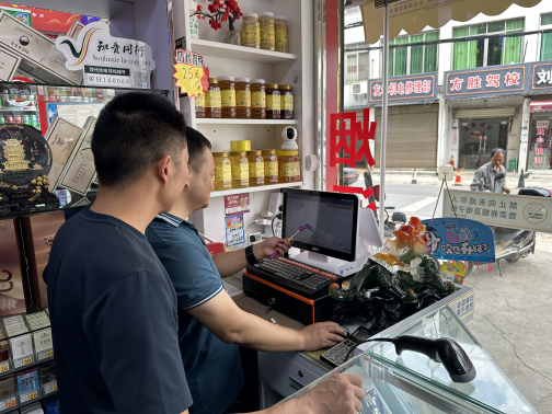 要做就做到最好,徐峰一方面做好“亮”堂管理,自购货架对商品进行分类摆放,张挂商品分区牌指引客户便捷消费,合理布局特色商品展示区吸引顾客消费。另一方面启用数智化“管家”,通过店铺管理系统进行在线支付,时时动态掌控全店铺商品“进、销、存”及各类商品盈利状况。