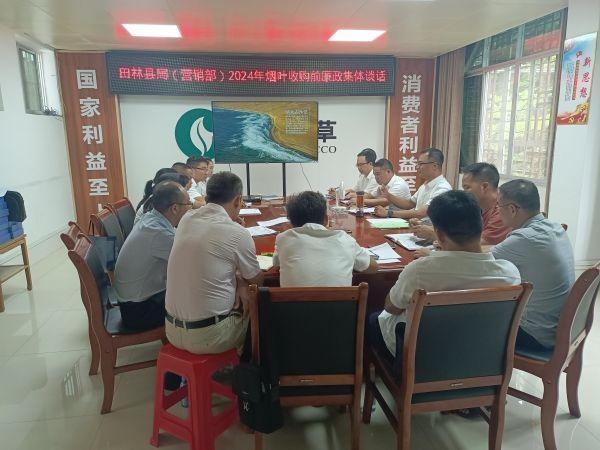 在烟叶收购工作即将全面展开之际,为进一步加强廉政建设,确保烟叶收购工作公正、规范、有序进行,近日,广西百色市田林县烟草专卖局(营销部)在市局纪检科的指导下组织召开了烟叶收购前廉政提醒集体谈话。