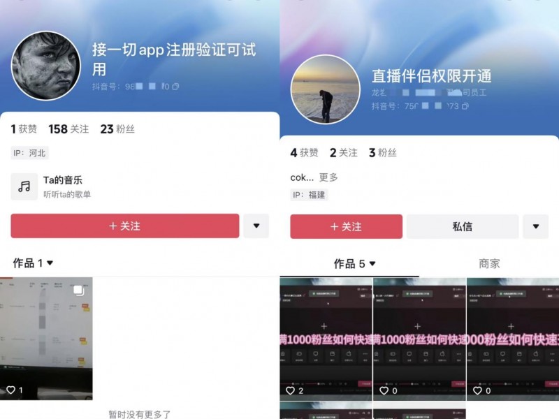 另一种场景,是大量平台对其部分功能有门槛限制,比如需要达到某个粉丝量,或者需要积攒一定的经验值、信用分等,网络水军则利用平台发布信息,称自己可以无门槛给用户开通各类“权限”。这些水军的行为不仅严重影响了相关平台的规则和社区环境,甚至给犯罪分子提供了作案的网络工具。抖音表示对此类水军账号将持续打击,从账户名、文案、视频图文等多角度建立样本库加强识别,一经核实永久封禁。
