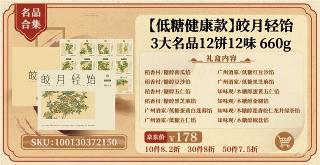 随着生活水平的提升,人们越来越注重饮食健康,市场对低脂低糖类月饼的需求更为旺盛。京东推出的“皎月轻饴”低糖健康款月饼礼盒,内配稻香村糖醇豆沙馅、广州酒家低糖蛋黄白莲蓉馅、知味观木糖醇椒盐馅等全系列低糖和糖醇月饼,符合现代人的健康理念,即使糖尿病患者及高血糖人士食用也没有负担。