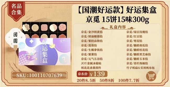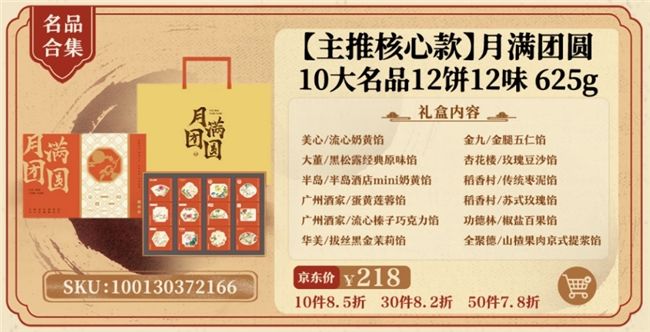 月饼不仅是中秋节的传统美食,更承载着人们对团圆、美满的期盼。京东今年主推的“月满团圆”款月饼礼盒,一盒集齐稻香村、广州酒家、美心、大董、半岛酒店、华美等十大品牌,包含了不同流派、不同口味的12种月饼,与中秋节象征的团圆、美满和幸福相得益彰,为节日增添了许多美好寓意。