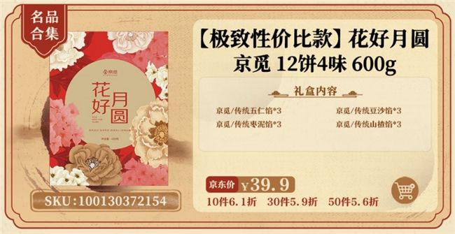 对于预算不足、想“少花钱、多办事”的企业采购人来说,可以考虑京东推出的“花好月圆”极致性价比款月饼礼盒,其中包含传统五仁、豆沙、枣泥、山楂等4种口味的12块月饼,京东企业客户到手价仅需39.9元,并且还能享受10件6.1折、30件5.9折、50件5.6折的超值折扣,买得越多省得越多!