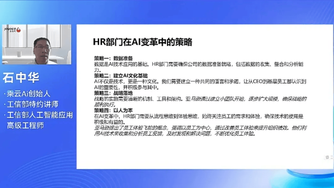 随着数字化转型的加速,AI技术的应用在各行各业中迅速崛起,尤其在人力资源领域,其影响力愈发显著。AI的引入使得招聘、培训、绩效评估、日常管理等环节得以智能化和自动化,极大提升了工作效率和效能,也使得企业能更好的应对日益复杂的员工需求和市场变化。因此,本次直播特别邀请了乘云AI创始人、工信部特邀讲师、工信部人工智能应用高级工程师石中华作为主讲嘉宾,围绕《AI给人力资源带来的机遇与挑战》这一主题深入探讨AI给人力资源领域带来的变革。