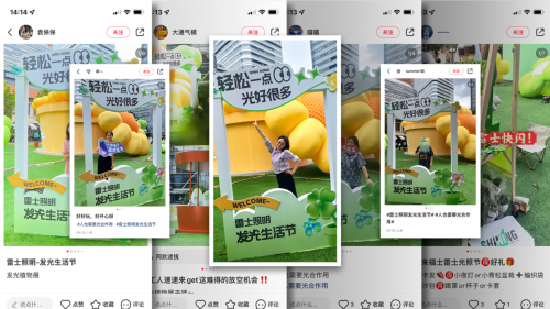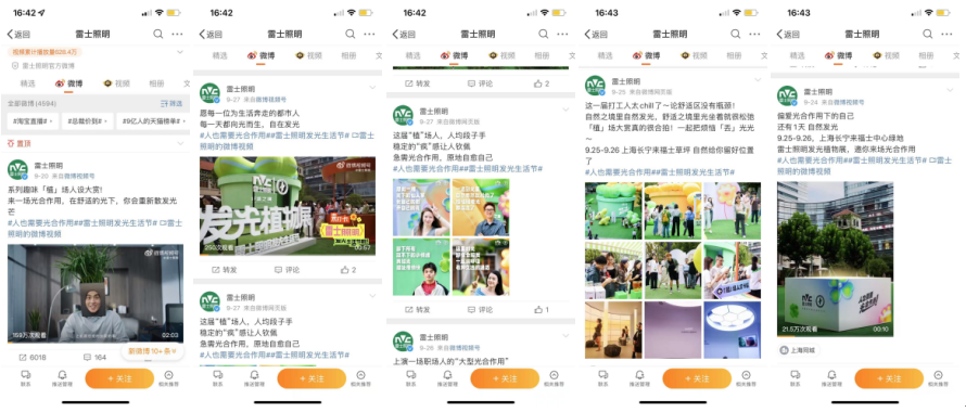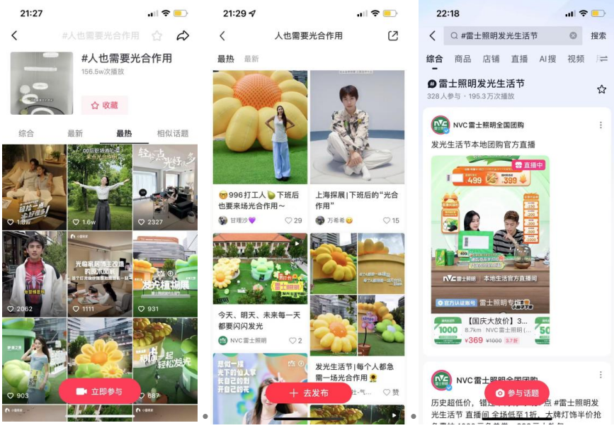 品牌官方平台作为发声主阵地,期间不间断放送创意视频、线下预告、直播回顾。产出众多优质内容,不断为品牌话题#雷士照明发光生活节##人也需要光合作用#输出热度。话题从微博热搜延伸到抖音、小红书等主流平台,发光生活节相关内容,占据话题实时热门内容首页。其中两大话题抖音总曝光量达350.6W+,558人参与。