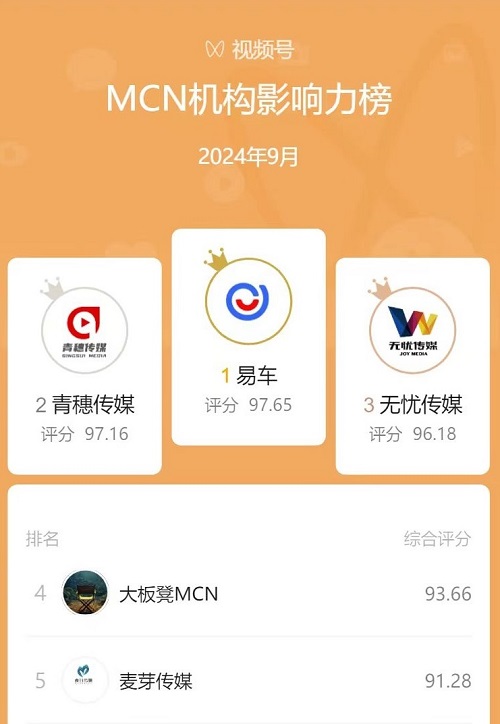 日前,视频号官方发布9月“MCN机构影响力榜”,知名汽车互联网平台易车旗下短视频MCN荣登榜首,成为视频号领域最受关注的MCN之一。