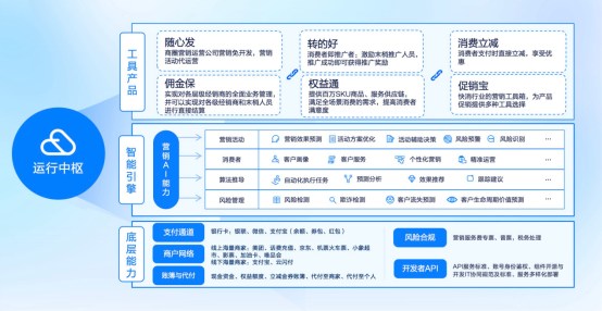 顶层架构中包含了多种工具产品,其中,“随心发”能够为企业免去开发流程,由专业团队提供营销活动代运营服务;“转的好”可以将消费者变为推广者,激励末梢推广人员,推广成功即可获得奖励;“佣金保”实现了对各层级经销商的全面业务管理,可以对各级经销商和末梢人员进行直接结算,完成营销闭环。