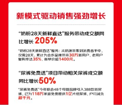作为京东超市首创并带动全行业实施的母婴公益活动,“尿裤免费送”项目已联合48个母婴品牌,引入388款纸尿裤,今年累计已为118万育儿家庭免费提供1亿片尿裤,平均为每户家庭降低超千元育儿成本。