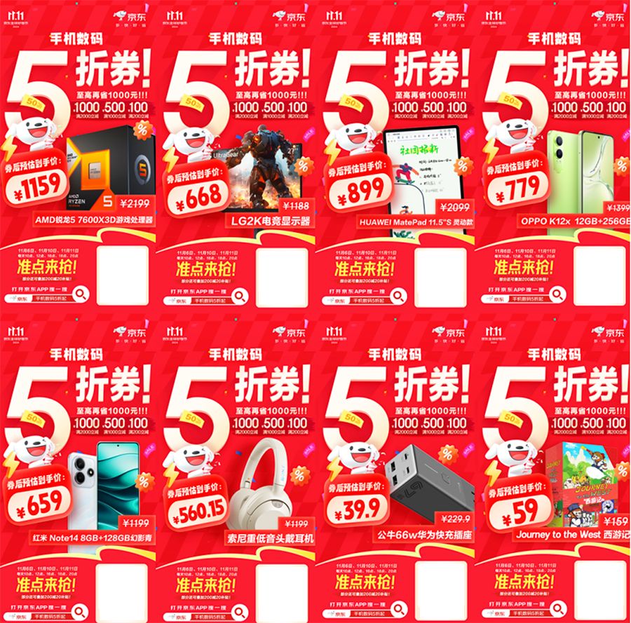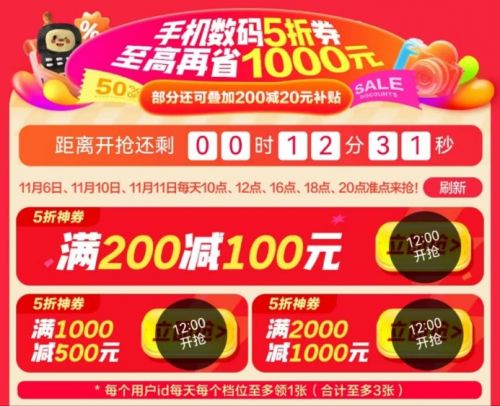 具体而言,京东11.11的5折优惠券活动将于11月6日、10日、11日开启,并于每天的10点、12点、16点、18点、20点准时发放,打开京东APP搜“手机数码5折起”即可进入活动会场首屏抢券。京东提供了满200减100元、满1000减500元、满2000减1000元三档5折神券,每个用户每天每档至多领1张,合计至多3张,下单3C数码产品更划算。没抢到的朋友还可以关注京东3C数码采销直播间,在相同的日期每天20点、21点、22点左右也会发放一波5折券。此外部分产品不但能使用5折神券,还能再叠加满200减20元的补贴,轻松获得“又便宜又好”的购物体验。