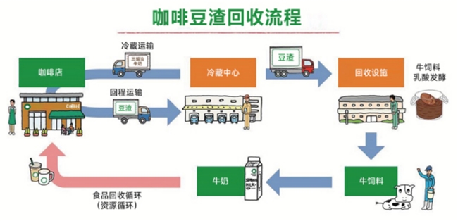 与日本星巴克合作进行咖啡豆渣回收并进行乳酸发酵,使其能够长期保存并作为饲料使用,目前已实现实用化。
