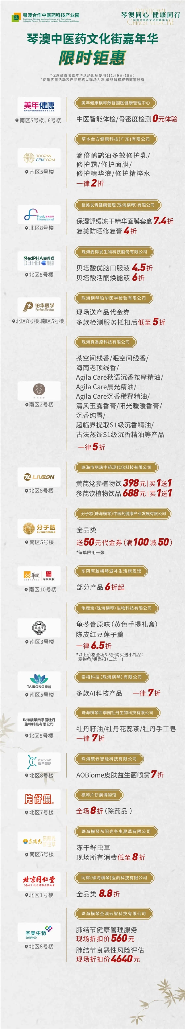 11月9日,琴澳中医药文化街即将在粤澳合作中医药科技产业园隆重开幕,并将举办为期两天的盛大嘉年华活动,来自北京同仁堂体验馆、东阿阿胶横琴滋补生活旗舰馆、横琴片仔癀博物馆、美年健康横琴数智国医健康管理中心、四季园牡丹生物科技、麦得发生物科技、东阳光冬虫夏草等多家知名中医药大健康品牌、医疗科技机构将在现场开展一系列特别体验活动与惊喜优惠,为当地市民与游客带来一场中医药文化与康养盛宴。