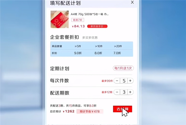 据介绍,企业客户通过京东企业购提供的“企业计划购”服务,可以实现一次下单、按需按计划配送,有效避免因周期性采购导致的频繁、重复下单等问题。同时,企业客户还可以根据实际物资消耗程度自定义采购方案,自由选择按周送、按月送的灵活配送模式,帮助企业建立更加智能化、自动化的进补货机制,大幅提升库存周转效率,实现轻库存乃至0库存的精益管理。