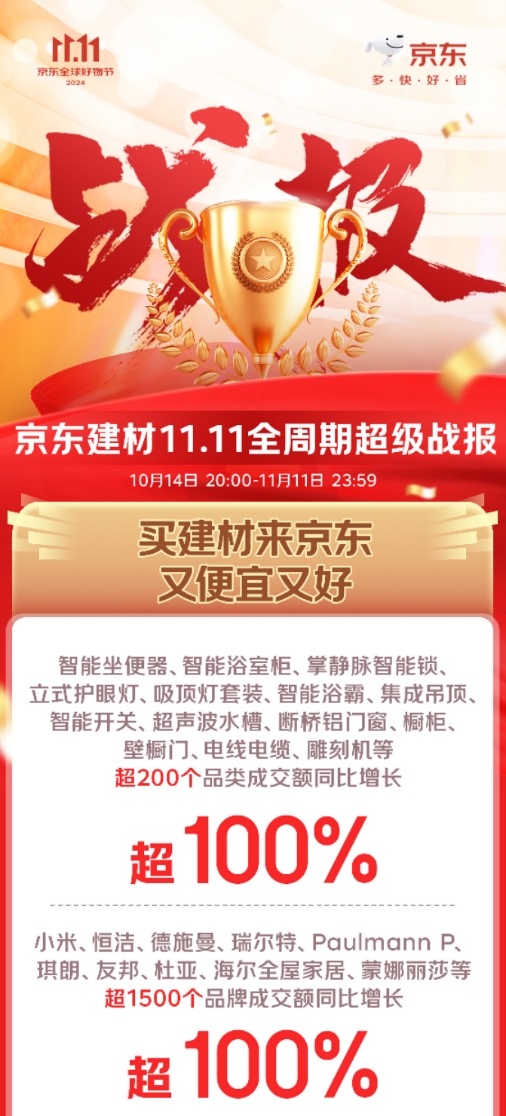 截至11月11日23:59,2024年京东11.11购物用户数同比增长超20%,京东采销直播订单量同比增长3.8倍。超17000个品牌成交额同比增长超5倍,超30000个中小商家成交额同比增长超2倍。在这个又便宜又好的京东11.11,千家万户旧貌换新颜,京东建材也将持续携手合作伙伴,以更高性价比的产品和更优的服务打造超预期消费体验,让更多家庭轻松焕新理想生活。