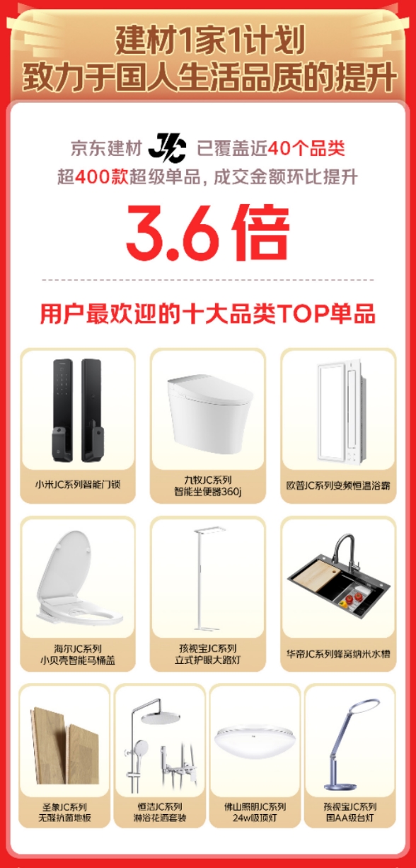 数据显示,京东11.11期间,京东建材超200个品类、超1500个品牌成交额同比增长均超过100%,超50个品牌店铺直播成交额同比增长超200%。高质价比的商品、人性化的省心服务成为消费增长密码,其中,京东建材“JC系列”单品成交额环比提升3.6倍,以旧换新成交额同比增长超10倍,自营灯饰包安装服务订单量同比增长超5倍。