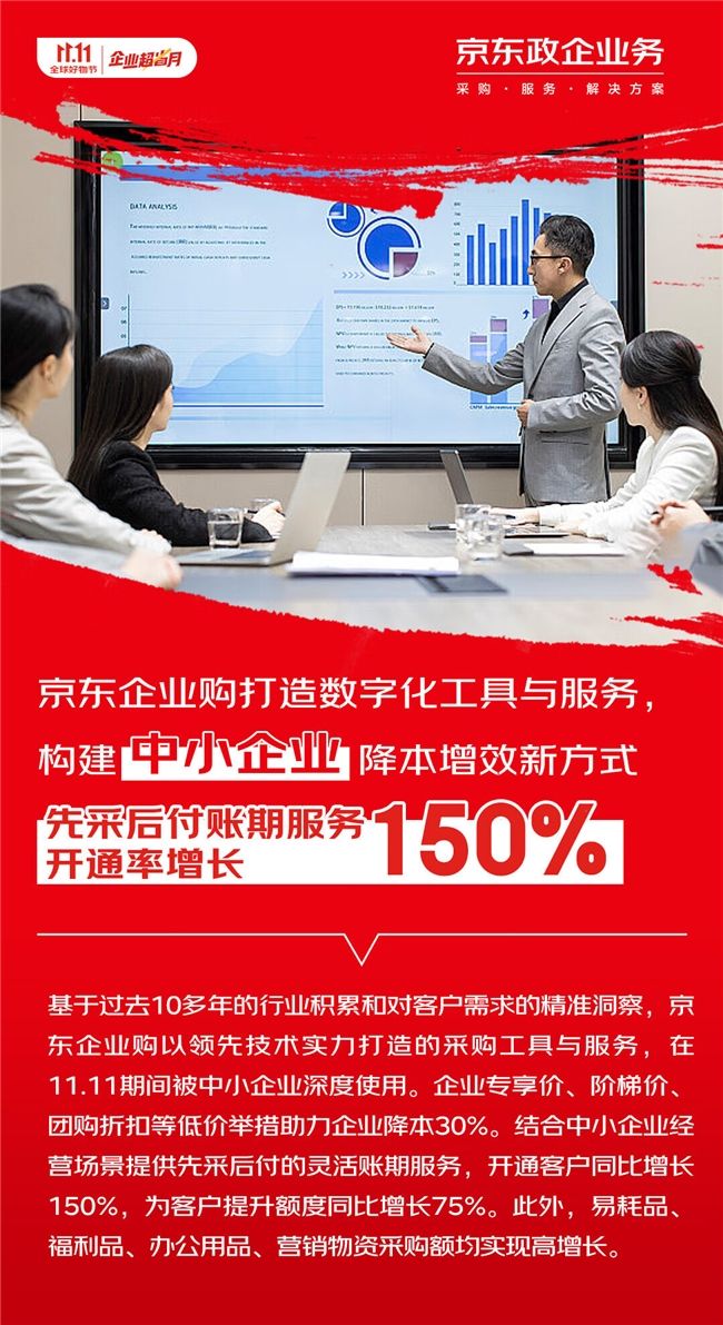 作为京东为中小企业提供快采购、轻管理、一站式采购服务综合平台,京东企业购推出了各类专属数字化工具与服务,助力中小企业采购“有资金、提效率、享低价”,企业专享价、阶梯价、团购折扣等举措,帮助企业降低采购成本超过30%。作为特色服务之一的企业采购管家在11.11期间服务的中小企业数量同比增长35%。致力于缓解企业资金紧张、提升经营效率的先采后付服务开通客户数同比增长150%。