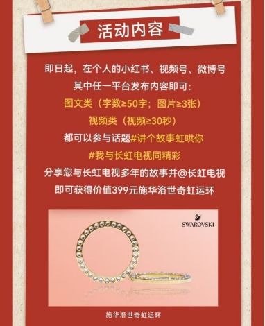 让我们一起讲述与长虹电视的故事吧!11月1日—12月10日期间,在小红书、视频号、微博号其中任一平台发布图文类(字数>50字;图片>3张)、视频类(视频≥30秒)内容,都可以参与话题#讲个故事虹哄你#我与长虹电视同精彩,分享您与长虹电视多年的故事并@长虹电视,即可获得价值399元施华洛世奇虹运环。