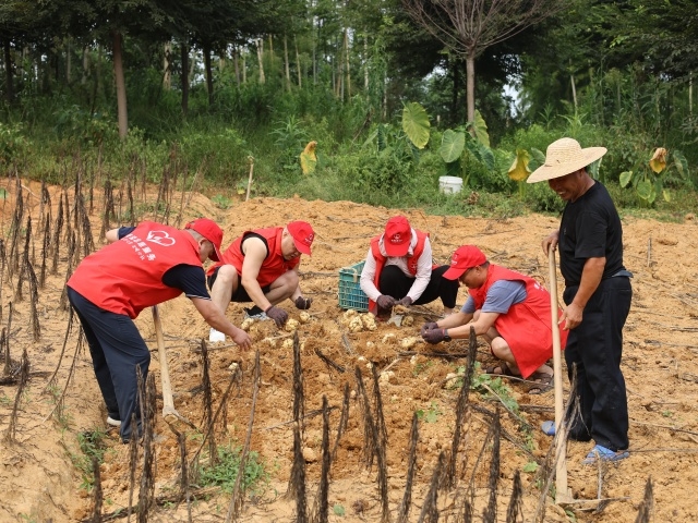图为志愿者在帮忙挖百合