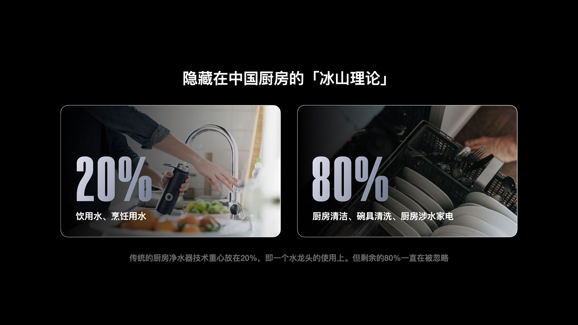 民以食为天,小小的一方厨房是中国家庭的心脏,承载着国人对于美好生活的向往,而水支撑起我们厨房里的日常,清、洗、煮、饮……厨房里的一切都离不开水。易开得发现隐藏在厨房里用水“冰山理论”:当前净水行业仅仅在满足厨房实际用水20%的直饮水、烹饪水等纯水需求上疯狂内卷,而80%的厨房清洁、碗具清洗、新型涉水家电的用水需求则被无视或未进行深入研发。