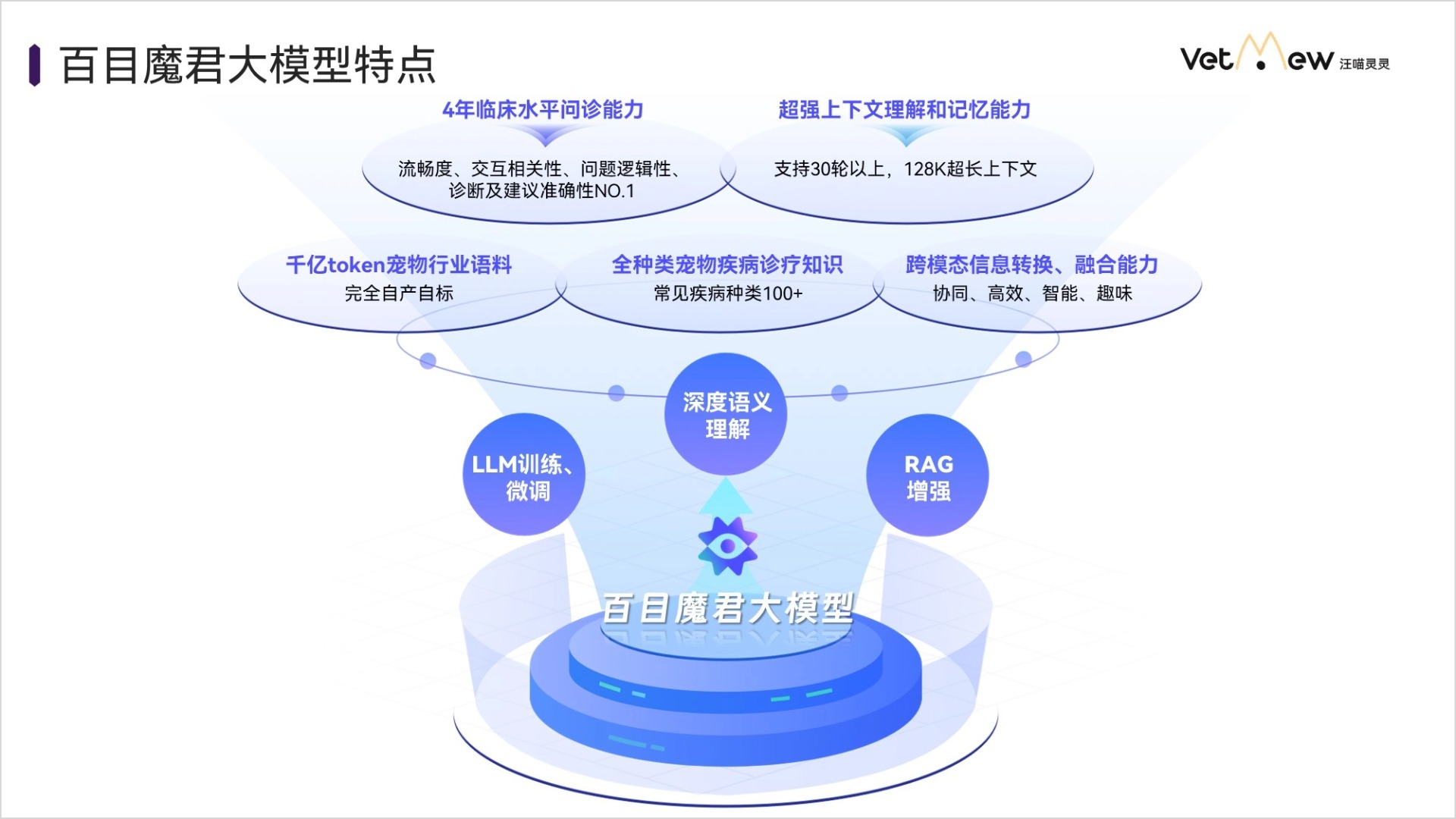 近日,汪喵灵灵宣布旗下自研宠物问诊AI大模型“百目魔君V1.0”正式上线,将全面替代此前的基础版本模型,标志着宠物健康管理领域的一次重大革新。该模型应用百亿级参数与千亿级宠物真实训练数据,覆盖107类病种,具备对用户语义的深刻理解和精准诊断建议能力,实现对宠物疾病的精准诊断与全面健康管理,将为用户带来前所未有的智能诊疗体验。
