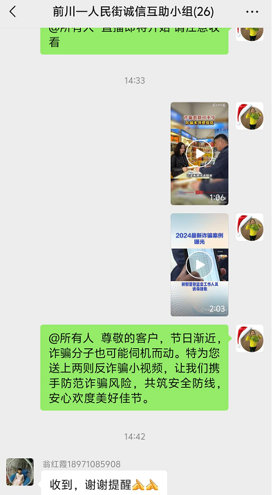 在线上方面,黄陂烟草利用诚信互助小组的微信群平台,发布反诈资讯给广大的零售商户。这些资讯包含了由武汉市反诈中心提供的真实案例和防范建议,同时也结合了日常生活中常见的诈骗手段,帮助商户们更好地辨别并预防潜在的欺诈行为,及时获取最新的反诈情报和安全指导。零售客户翁女士表示:“这些信息非常实用,特别是那些发生在我们周围的案例,让我更加警惕,学会了如何避免成为诈骗的受害者。”